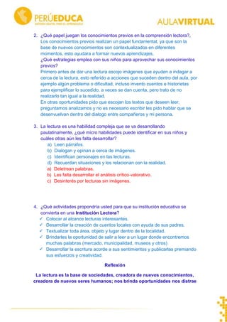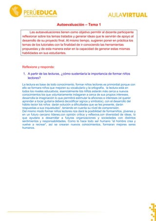 El documento presenta una autoevaluación de un docente sobre la formación de lectores. El docente destaca la importancia de formar niños lectores porque la lectura es la base del conocimiento y permite el desarrollo de habilidades como el vocabulario, la ortografía y la imaginación. También menciona que utiliza estrategias como imágenes e historias para aprovechar los conocimientos previos de los niños y facilitar la comprensión lectora. Finalmente, propone actividades como tener lecturas accesibles, publicar escritos de los niños y visit