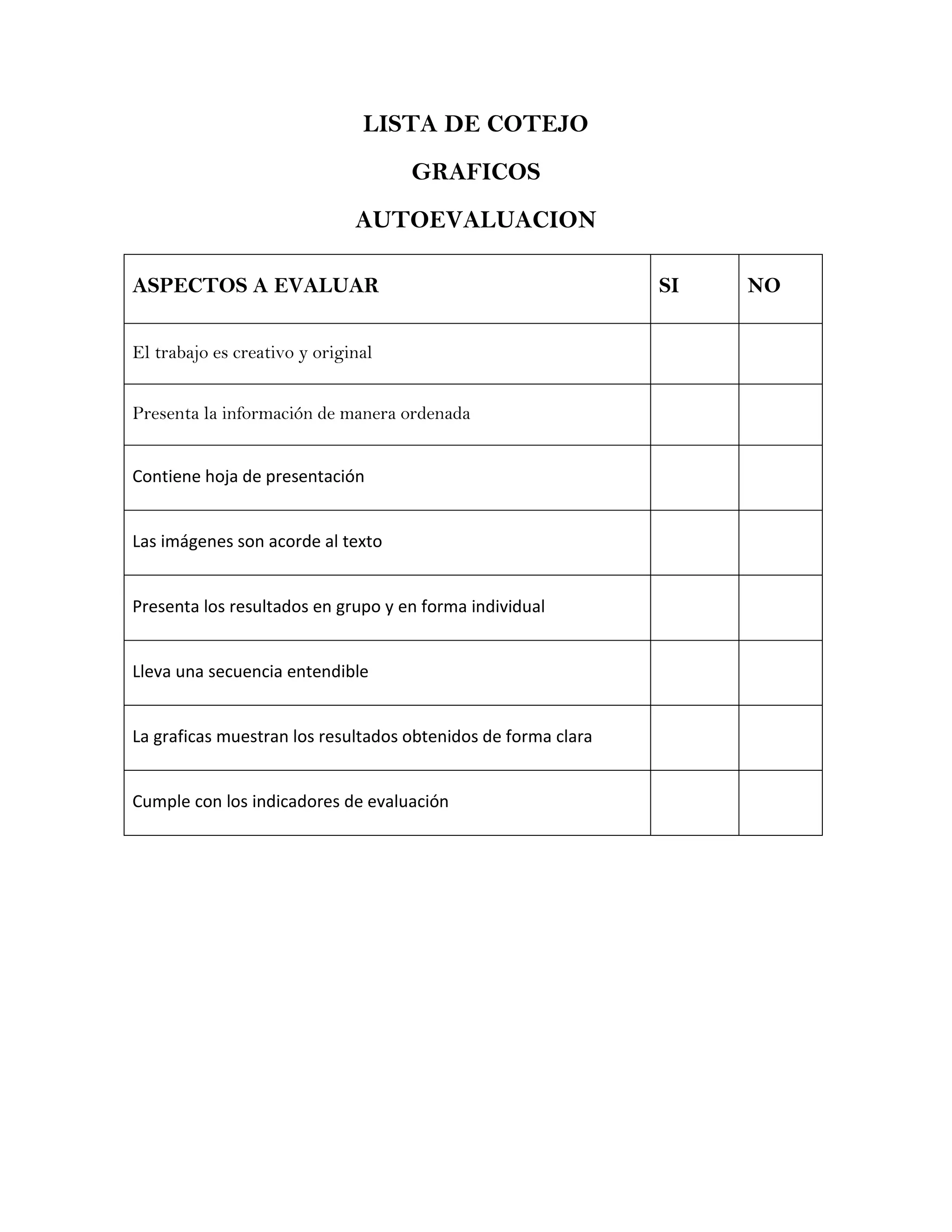 El documento presenta una lista de cotejo para autoevaluar gráficos. Contiene 8 aspectos a evaluar sobre si un trabajo de gráficos es creativo, presenta la información de manera ordenada, contiene hoja de presentación, las imágenes son acordes al texto, presenta resultados de forma individual y grupal, lleva una secuencia entendible, las gráficas muestran claramente los resultados y cumplen con los indicadores de evaluación.