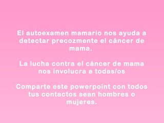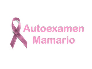El documento habla sobre la importancia del autoexamen mamario para la detección temprana del cáncer de mama. Explica que el cáncer de mama afecta principalmente a las mujeres mayores de 45 años y que el autoexamen una vez al mes después de la menstruación puede ayudar a detectar bultos o cambios sospechosos. También recomienda que las mujeres mayores de 45 años se hagan una mamografía anualmente.