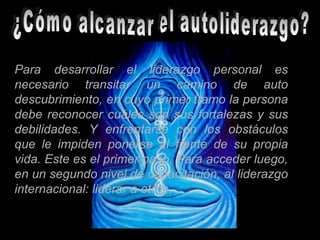 El documento describe las competencias claves para lograr el autoliderazgo. Estas incluyen la autoestima, el rediseño de modelos mentales limitantes, tener objetivos claros, la aplicación de la inteligencia emocional y la flexibilidad. El autoliderazgo es la capacidad de liderarse a uno mismo para descubrir un modelo de existencia único e irrepetible mediante el autoconocimiento y el enfrentamiento de obstáculos.