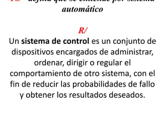 Un sistema automático es un conjunto de dispositivos que regulan el comportamiento de otro sistema para obtener resultados deseados. Los sistemas en lazo cerrado monitorean la salida y ajustan la entrada para mantener el control, mientras que los sistemas en lazo abierto no tienen retroalimentación. Algunos ejemplos de sistemas automáticos son calentadores de agua (lazo cerrado) y aspersores (lazo abierto).