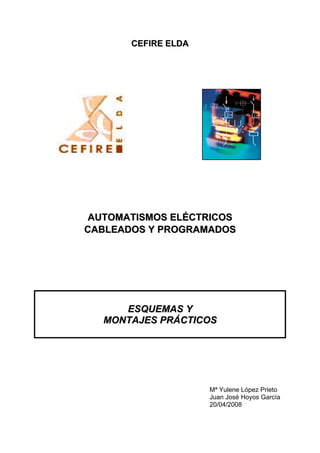 Este documento presenta 10 esquemas prácticos de automatismos eléctricos cableados, incluyendo el arranque y paro de motores mediante pulsadores, la inversión de giro de motores, el uso de temporizadores, el arranque estrella-triángulo, el control de velocidad con variadores de frecuencia y aplicaciones como escaleras mecánicas, portones corredizos y semáforos. También describe 2 esquemas de automatismos eléctricos programados y 3 ejercicios propuestos sobre este tema.