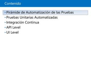 El documento describe las prácticas modernas de pruebas basadas en Lean/Agile, incluyendo la automatización de pruebas. Explica la pirámide de automatización de pruebas, con las pruebas unitarias automatizadas en la base. También cubre la integración continua, las pruebas a nivel de API y de interfaz de usuario, usando marcos como Selenium WebDriver.