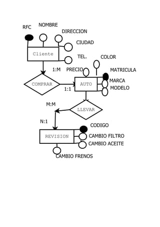 Este documento describe las relaciones entre un cliente, un auto y los servicios de mantenimiento. Un cliente puede comprar uno o más autos y cada auto puede recibir uno o más servicios de mantenimiento como cambio de aceite o filtros. Los servicios están codificados y cada código se asigna a un solo servicio de mantenimiento.