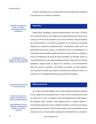 Existen dos tipos de motivaciones: la interna y la externa. La motivación interna proviene de factores como las convicciones, creencias, intención, propósito, misión, sentido de vida, entusiasmo, aspiraciones, valores e ideales del individuo. Tener claridad sobre estos elementos internos genera una energía y motivación duradera para alcanzar las metas.