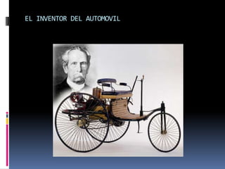 El documento proporciona información sobre el inventor del automóvil, Nicholas Joseph Cugnot. Cugnot, un ingeniero militar francés, comenzó a experimentar con vehículos de vapor en 1765 para transportar cañones. En 1769 presentó el primer coche de vapor y en 1770 mejoró el diseño para que pudiera tirar 4 toneladas a 4 km/h. Aunque su trabajo fue pionero, el automóvil moderno no se desarrolló hasta 1886.