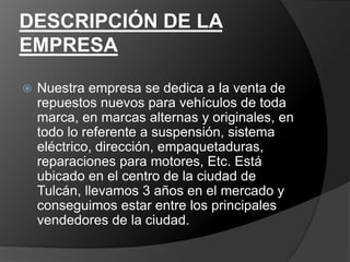 Este documento presenta un análisis FODA y un plan de marketing para una empresa de repuestos para vehículos en Tulcán, Ecuador. El análisis FODA muestra que las fortalezas y oportunidades superan a las debilidades y amenazas. El plan de marketing incluye estrategias de precios, segmentación del mercado, ubicación, publicidad y ventas para aumentar las ventas de lubricantes.