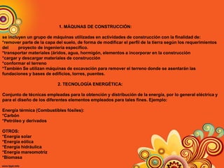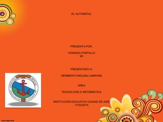 El documento presenta información sobre varios temas tecnológicos como máquinas de construcción, energía, telecomunicaciones, tecnología visual y acústica, electrónica, informática, robótica y nanotecnología. También describe la historia del automóvil desde su invención en 1769 por Nicolas Joseph Cugnot hasta los avances actuales. El automóvil ha revolucionado el transporte y ha tenido un gran impacto económico, cultural y social.
