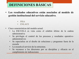 El documento aborda la necesidad de desarrollar la autonomía de gestión escolar como clave para reestructurar el servicio educativo en México. Se destaca que un nuevo modelo de gestión institucional debe centrarse en las decisiones dentro de las escuelas para mejorar los resultados educativos. La autonomía escolar permitirá que las instituciones formulen planes de mejora adaptados a su contexto y se conviertan en más eficaces en la atención a la diversidad y la reducción de la deserción escolar.