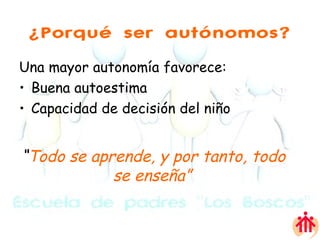 El documento describe diferentes aspectos de la autonomía en niños y cómo se puede fomentar. Promover la autonomía ayuda a mejorar la autoestima y capacidad de decisión de los niños. Se debe permitir que los niños realicen pequeñas tareas por sí mismos en lugar de anticiparnos, y respetar sus decisiones. Esto incluye el autocuidado, la comunicación, las habilidades académicas, el ocio, la vida en la comunidad y en el hogar.