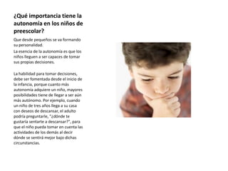 La autonomía se refiere a la capacidad de los individuos para tomar sus propias decisiones e independizarse. Es importante desarrollar la autonomía en los niños desde pequeños para que formen su personalidad y sean capaces de elegir por sí mismos. Los padres deben fomentar la autonomía dando a los niños opciones y responsabilidades acordes a su edad para que se sientan seguros tomando sus propias decisiones.