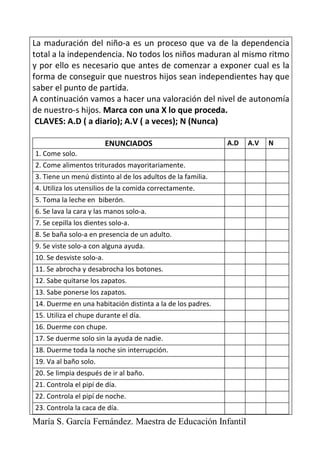 El documento trata sobre la importancia de fomentar la autonomía en los niños desde la infancia, destacando que cada niño progresa a su propio ritmo. Se ofrecen pautas para que los padres y educadores colaboren en este proceso, evitando la sobreprotección y promoviendo la práctica de hábitos básicos. También se presentan herramientas, como un calendario de logros, para motivar a los niños en su desarrollo autónomo.
