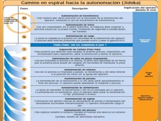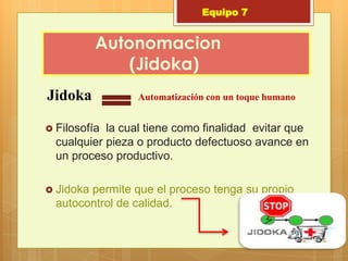 El documento describe los conceptos de jidoka y poka yoke, que son técnicas de calidad desarrolladas en Japón. Jidoka se refiere a la automatización con control humano, donde los procesos se detienen automáticamente cuando se detecta un defecto. Poka yoke significa "a prueba de errores" y se refiere a dispositivos que previenen errores en la producción. El documento explica cómo funcionan estos enfoques y sus beneficios para mejorar la calidad y reducir defectos.