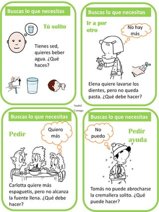Este documento contiene una serie de tarjetas con preguntas y respuestas sobre habilidades sociales y de autonomía para niños. Incluye temas como el aseo personal, los modales, la alimentación, compras, ocio, vestimenta, tareas domésticas, cómo funcionan las cosas, dinero, excursiones y más. Las tarjetas fueron creadas por un grupo de autoras y utilizan pictogramas e imágenes de internet.