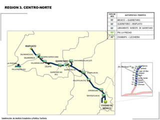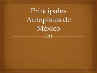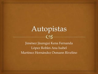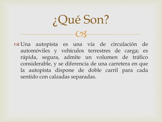 Las autopistas son vías rápidas y seguras para el tráfico de vehículos que tienen carriles separados para cada sentido. Permiten un alto volumen de tráfico e incluyen automóviles, camiones de pasajeros, camiones y remolques que transportan carga.