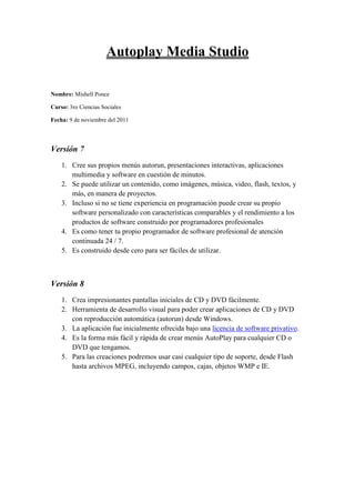 Este documento proporciona información sobre el software Autoplay Media Studio. Señala que permite a usuarios sin experiencia en programación crear fácilmente presentaciones interactivas, aplicaciones multimedia y software personalizado utilizando contenido como imágenes, música y video. También facilita la creación de pantallas de inicio y menús de reproducción automática para CDs y DVDs a través de una interfaz visual sin necesidad de código.