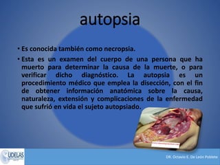 La autopsia es un examen médico del cuerpo después de la muerte para determinar la causa. Se clasifica en clínica o forense. La forense establece la causa, manera y hora de la muerte, así como la identidad. Requiere exámenes externos e internos, y análisis de muestras. Los informes deben especificar claramente los hallazgos. La exhumación permite nuevos exámenes por orden judicial.