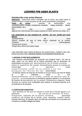Una autopsia examina un cuerpo para determinar la causa de muerte, mientras que una necropsia estudia un cadáver sin disección interna. Una biopsia toma una muestra de tejido para análisis. Las heridas por arma blanca se clasifican como incisas, cortocontundentes, cortopunzantes o punzantes dependiendo del arma y mecanismo. La autopsia describe las heridas y órganos lesionados para determinar la causa y forma de muerte.