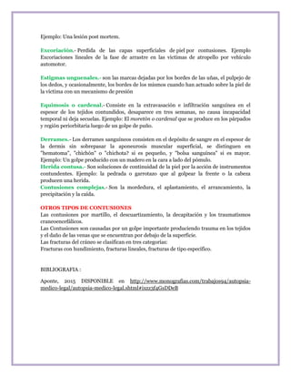 La autopsia es un examen médico del cuerpo después de la muerte para determinar la causa. Existen dos tipos de autopsia: la autopsia clínica realizada por un patólogo para confirmar la causa de muerte por enfermedad, y la autopsia forense realizada por un médico forense para informar a las autoridades sobre la causa y circunstancias de la muerte. Los objetivos de la autopsia forense son establecer la causa, manera y hora de la muerte, así como la identidad de la persona fallecida. El documento