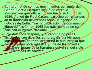 Gabriel García Márquez fue un novelista colombiano nacido en 1928 en Aracataca, Colombia. Estudió derecho y periodismo y comenzó su carrera como periodista. Publicó su primera novela La hojarasca en 1955. Más tarde, escribió Cien años de soledad en 1967, la cual es considerada una de las novelas más importantes del siglo XX. Fue amigo de Fidel Castro y participó en la fundación de Prensa Latina, la agencia de noticias de Cuba. Recibió el Premio Nacional de su país en 1965.