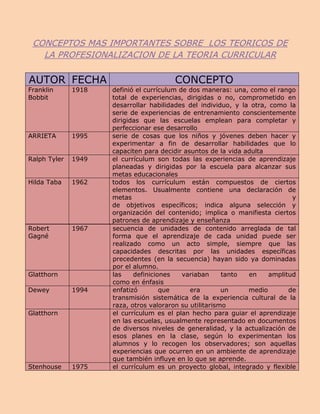 El documento presenta las definiciones y conceptos clave de varios teóricos de la teoría curricular a través de los años. Ralph Tyler definió el currículum como todas las experiencias de aprendizaje planeadas por la escuela para alcanzar sus metas educativas. Hilda Taba indicó que los currículums contienen declaraciones de metas y objetivos, selección y organización de contenido, y patrones de enseñanza y aprendizaje. Otmara González describió el currículum como un proyecto sistematizado de formación y