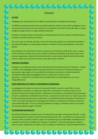 El documento resume las ideas y métodos pedagógicos de varios pensadores de la Escuela Nueva como Pestalozzi, Cousinet, Decroly y Luzuriaga. Pestalozzi promovió la educación popular basada en el desarrollo natural del niño. Cousinet propuso el trabajo en grupos y la investigación. Decroly desarrolló un método ideovisual y globalizador. Luzuriaga abogó por una escuela unificada e igualitaria para todos los niños.
