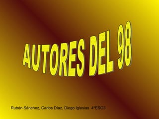 El documento resume las biografías y obras principales de 5 escritores españoles de la generación del 98: Miguel de Unamuno, Pío Baroja, Azorín, Antonio Machado y Valle-Inclán. Se destacan los temas y estilos literarios abordados por cada autor, así como obras representativas como Niebla, La busca, La voluntad, Campos de Castilla y Los Esperpentos.
