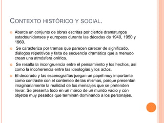Este documento describe las características del teatro del absurdo, un movimiento teatral que surgió en Europa y Estados Unidos entre las décadas de 1940 y 1960. Se caracteriza por obras con tramas sin sentido, diálogos repetitivos y falta de secuencia dramática para crear una atmósfera onírica. Autores representativos incluyen a Eugène Ionesco, Samuel Beckett y Harold Pinter. También se menciona brevemente el teatro épico alemán de Bertolt Brecht.