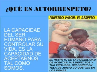 El documento habla sobre el autorrespeto y cómo aceptarse a uno mismo. Explica que el autorrespeto es la capacidad de controlar la propia vida y aceptarse tal como se es. Luego, ofrece algunos consejos para mejorar el autorrespeto, como no enfocarse solo en los errores, no ser demasiado perfeccionista, y recordar que todos los seres humanos son igualmente valiosos. Finalmente, concluye que el autorrespeto es mantener el equilibrio ante uno mismo como persona, ser humano y ser social y espiritual.