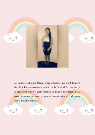 Fátima Núñez tiene 20 años y nació el 20 de mayo de 1998. Actualmente estudia psicología educativa en la facultad de ciencias de la educación. Le gusta leer y escuchar música, y su color favorito es el azul.