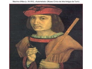 El documento presenta información sobre varios artistas del Renacimiento, incluyendo retratos de personajes históricos y autorretratos de los propios artistas como Leonardo da Vinci, Tiziano, Durero, Caravaggio y Arcimboldo. Los artistas adquirieron un nuevo estatus social durante este periodo y buscaron expresar su singularidad a través del arte del retrato y el autorretrato.