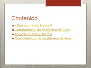 Este documento describe los autos híbridos, incluyendo que son la fusión de un motor de combustión interna y un motor eléctrico. Explica los componentes clave de los sistemas híbridos como el motor de combustión, motor eléctrico, generador, baterías y divisores de potencia. También describe los tres tipos principales de sistemas híbridos - serie, paralelo y paralelo/serie. Finalmente, resalta las características clave de los sistemas híbridos como la recuperación de energía y la redu