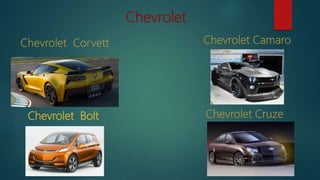 Chevrolet es una marca estadounidense de automóviles y camiones perteneciente a General Motors. Actualmente Chevrolet incrementó su participación en el mercado mundial a través de vehículos denominados "globales" que se venden en varias regiones. BMW es un fabricante alemán de automóviles y motocicletas de gama alta con subsidiarias como Rolls-Royce y Mini. Mazda es un fabricante japonés de automóviles con sede en Hiroshima que comenzó produciendo vehículos de dos ruedas y ahora