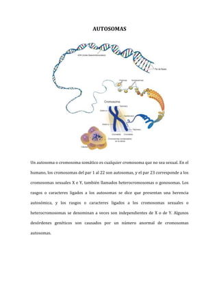 Los autosomas son cualquier cromosoma que no sea sexual. En humanos hay 22 pares de autosomas y un par de cromosomas sexuales. Los cromosomas homólogos son pares idénticos que contienen los mismos genes en el mismo orden, uno heredado del padre y uno de la madre. La dotación cromosómica normal en humanos es 46 cromosomas formados por 22 pares de autosomas homólogos y un par de cromosomas sexuales. Las aberraciones cromosómicas son cambios estructurales o de número que ocurren
