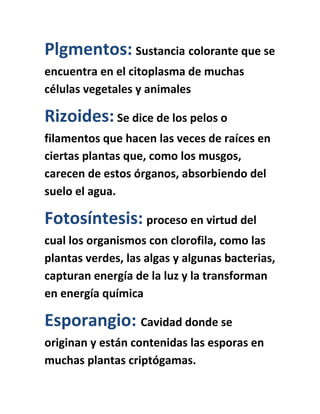 El documento define términos clave relacionados con la biología de plantas, incluyendo autótrofo, esporofito, heterótrofo y gametofito, los cuales se refieren a la capacidad de sintetizar materia orgánica y a las fases alternas en el ciclo de vida de las plantas. También explica conceptos como pigmentos, rizoides, fotosíntesis y esporangio, los cuales se refieren a sustancias colorantes, pelos absorbentes de agua, el proceso de captura de energía lumínica y