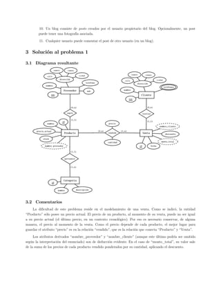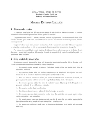 El documento presenta dos problemas de modelado de bases de datos usando el modelo entidad-relación. El primer problema propone modelar un sistema de ventas, resultando en cuatro entidades principales (Proveedor, Cliente, Producto y Venta) y sus relaciones. El segundo problema propone modelar un sitio social de fotografías, resultando en seis entidades débiles y dos entidades principales.