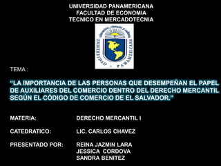 Este documento resume la importancia de los auxiliares del comercio en el derecho mercantil salvadoreño según el Código de Comercio. Explica que los auxiliares incluyen factores, dependientes, agentes de comercio, agentes intermediarios, y clasifica cada tipo. Resalta que los auxiliares son importantes porque ayudan a los comerciantes a manejar sus negocios de manera más efectiva.