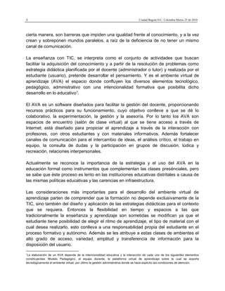 El documento discute la importancia de los ambientes virtuales de aprendizaje en la enseñanza y el aprendizaje del siglo XXI. Explica que las tecnologías de la información son fundamentales en el proceso educativo para comprenderlas y usarlas efectivamente en la adquisición del conocimiento. También destaca que los docentes deben actualizarse en el uso de estas herramientas y que los ambientes virtuales deben diseñarse de manera colaborativa e interdisciplinaria para cumplir con requerimientos pedagógicos y de interfaz y así facilit