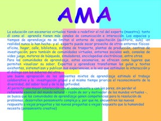 El documento describe los ambientes virtuales de aprendizaje y los ambientes mixtos de aprendizaje. Explica que estos ambientes permiten una mayor interacción entre expertos y aprendices sin limitaciones de espacio o tiempo. También destaca que estos ambientes estimulan el aprendizaje colaborativo y el reconocimiento de la diversidad.