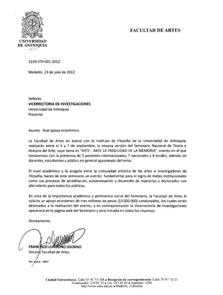 El documento presenta tres solicitudes de aval para la realización del noveno Seminario Nacional de Teoría e Historia del Arte con el tema "ARTE: ANTE LA FRAGILIDAD DE LA MEMORIA". La Facultad de Artes y el Instituto de Filosofía solicitan apoyo económico a la Vicerrectoría de Investigaciones y al Fondo de Organización de Eventos para financiar el evento con expositores internacionales y nacionales.