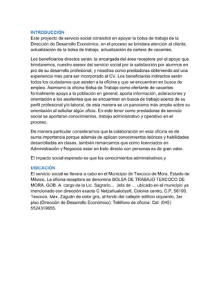 Este documento presenta un proyecto de servicio social que consiste en colaborar administrativamente en la bolsa de trabajo de la Universidad Autónoma Chapingo en Texcoco, México. Tres estudiantes de administración y negocios apoyarán en la atención a clientes, actualización de la bolsa de empleos y cartera de vacantes de agosto de 2014 a marzo de 2015. El proyecto beneficiará a la oficina receptora, el asesor y las estudiantes a través del desarrollo de habilidades profesional