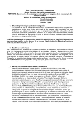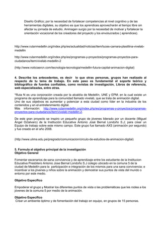 El documento presenta un proyecto de investigación que busca determinar cómo la creación de animación por fotografía afecta los comportamientos de convivencia y sociales en los jóvenes de una institución educativa en Medellín. El proyecto propone crear grupos de estudiantes que usarán la técnica de stop motion para plasmar sus perspectivas sobre temas de su entorno. El objetivo es fomentar una sana convivencia entre los estudiantes y motivarlos a aprovechar su tiempo libre de manera productiva.