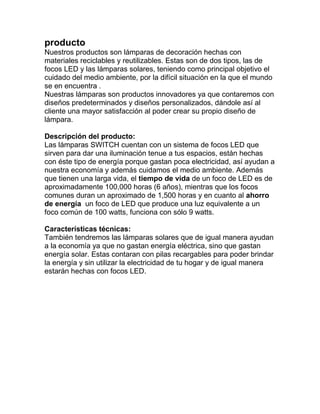 La empresa produce lámparas decorativas hechas de materiales reciclables y reutilizables, con diseños predeterminados y personalizados. Sus lámparas son innovadoras porque usan LEDs o energía solar, lo que ahorra electricidad y beneficia al medio ambiente y la economía.