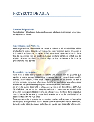 El proyecto aborda las dificultades que enfrentan los adolescentes sin experiencia laboral al buscar empleo, ofreciendo orientación sobre el uso de tecnología y consejos para mejorar su hoja de vida. Se incluyen análisis de herramientas digitales que facilitan la búsqueda de empleo, destacando la importancia de adaptar la hoja de vida y utilizar plataformas como Aliado Laboral, Computrabajo y Bumeran. Además, se propone desarrollar una página web informativa para ayudar a los estudiantes a acceder a oportunidades laborales.