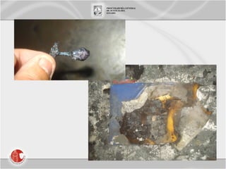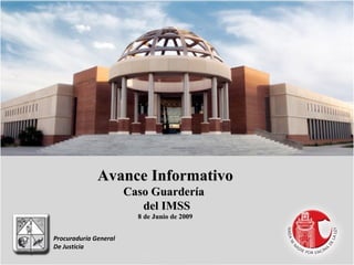 El documento resume los hallazgos preliminares de la investigación del incendio en una guardería del IMSS en México. Se encontró que el fuego se originó por el sobrecalentamiento del motor de un cooler en un almacén contiguo a la guardería, debido al uso de extensiones eléctricas improvisadas y la sobrecarga de un multicontacto. La propagación del humo se facilitó por oquedades y deformaciones en las paredes y techos compartidos entre el almacén y la guardería.