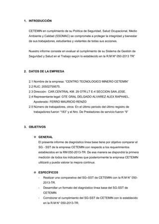 El documento presenta el informe de diagnóstico de línea base del Sistema de Gestión de Seguridad y Salud en el Trabajo de la empresa CETEMIN. El resumen evalúa el cumplimiento de CETEMIN en diferentes áreas como compromiso e involucramiento, política de SST, planeamiento y aplicación, implementación y operación, evaluación normativa y verificación. En general, CETEMIN cumple con la mayoría de los requisitos pero se identifican algunas oportunidades de mejora continua en aspectos como actualización de documentos y evalu