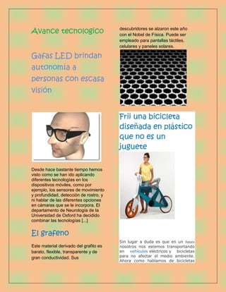 Este documento presenta varios avances tecnológicos como un chip que imita el cerebro humano desarrollado por IBM, un bastón inteligente que monitorea signos vitales, y un automóvil que funciona con vino y queso.