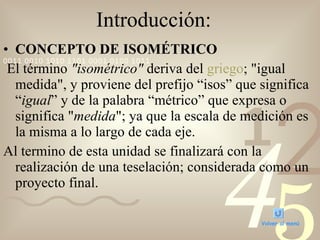 El documento trata sobre el tema de la isometría en geometría. Explica conceptos como simetría, traslación, y teselación e incluye ejemplos y ejercicios sobre estos temas. Al final, propone como proyecto final la creación de una teselación utilizando los conocimientos adquiridos.