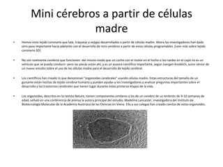 Los investigadores han desarrollado "organoides cerebrales" del tamaño de un guisante usando células madre, que tienen componentes similares a los de un cerebro embrionario de 9-10 semanas. Estas estructuras pueden ayudar a estudiar el desarrollo cerebral y trastornos. El robot Curiosity de la NASA ha explorado Marte durante dos años, buscando signos de vida pasada o presente. Android es un sistema operativo móvil de código abierto desarrollado originalmente por Android Inc. y comprado por Google en 2005