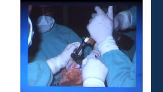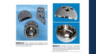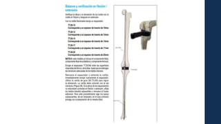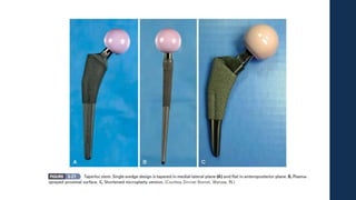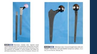 Este documento resume la historia y los avances en las prótesis de cadera. Comienza describiendo el primer uso de implantes metálicos en la década de 1940 y continúa detallando los desarrollos clave en las prótesis de cadera a lo largo de las décadas de 1950 y 1960. Luego describe los tipos principales de prótesis de cadera, incluidas las hemiartroplastias unipolares y bipolares y las artroplastias totales. Finalmente, cubre temas como los abordajes quirúrgicos, los component